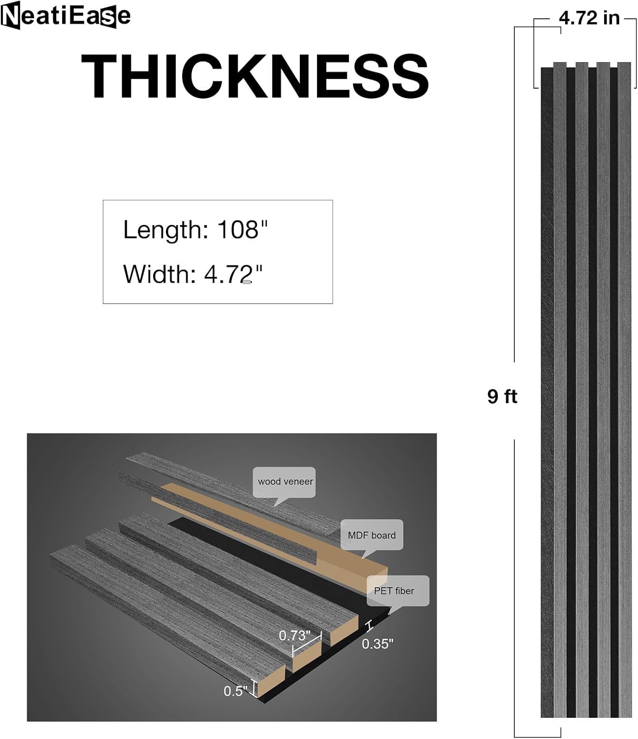 NeatiEase (Dark Gray) 3D Wood Wall Panel, 9 Feet Acoustic Slat Wall Panels for Interior Wall Decor and Noise Reduction, Decorative Slat Wall Paneling